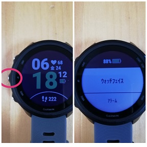 まずはじめに、左側の真ん中「アップ(UP)ボタン」を長押しします。すると、『ウォッチフェイス』の変更画面に移ります。